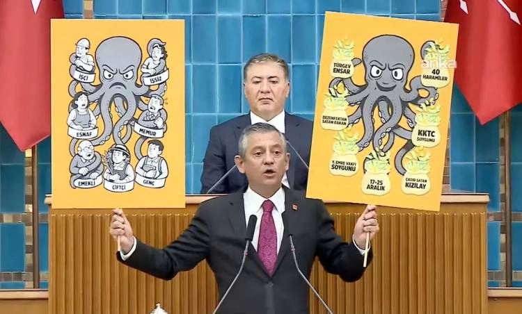 CHP Genel Başkanı Özgür Özel, dün akşam Halk TV'de gündeme ilişkin açıklamalarda bulundu. Erdoğan'ın "İstanbul'dan Türkiye'ye ve yurt dışına uzanan ahtapotun kolları bir bir deşifre oluyor" sözlerini anımsatan Özel, şunları söyledi: "Ben yarın ona bir ahtapot göstereceğim. Bunu ilk kez söylüyorum. Bir kere bir an için doğru olduğunu düşünelim söylediğinin. Bunda da yargının bağımsız ve tarafsız olmadığı, gizli yürütülmekte olan bir soruşturmadan Erdoğan’a bilgi verdiği sonucu çıkar. Ben Erdoğan’ın bir tek gördüğü ahtapotu, yarın grup toplantımızı izleyen herkese göstereceğim inşallah. O ahtapot nasıl bir ahtapotmuş diye. Ahtapotu bir görsün bakalım. Ahtapot dediğin nasıl bir şey oluyormuş, görelim bakalım."