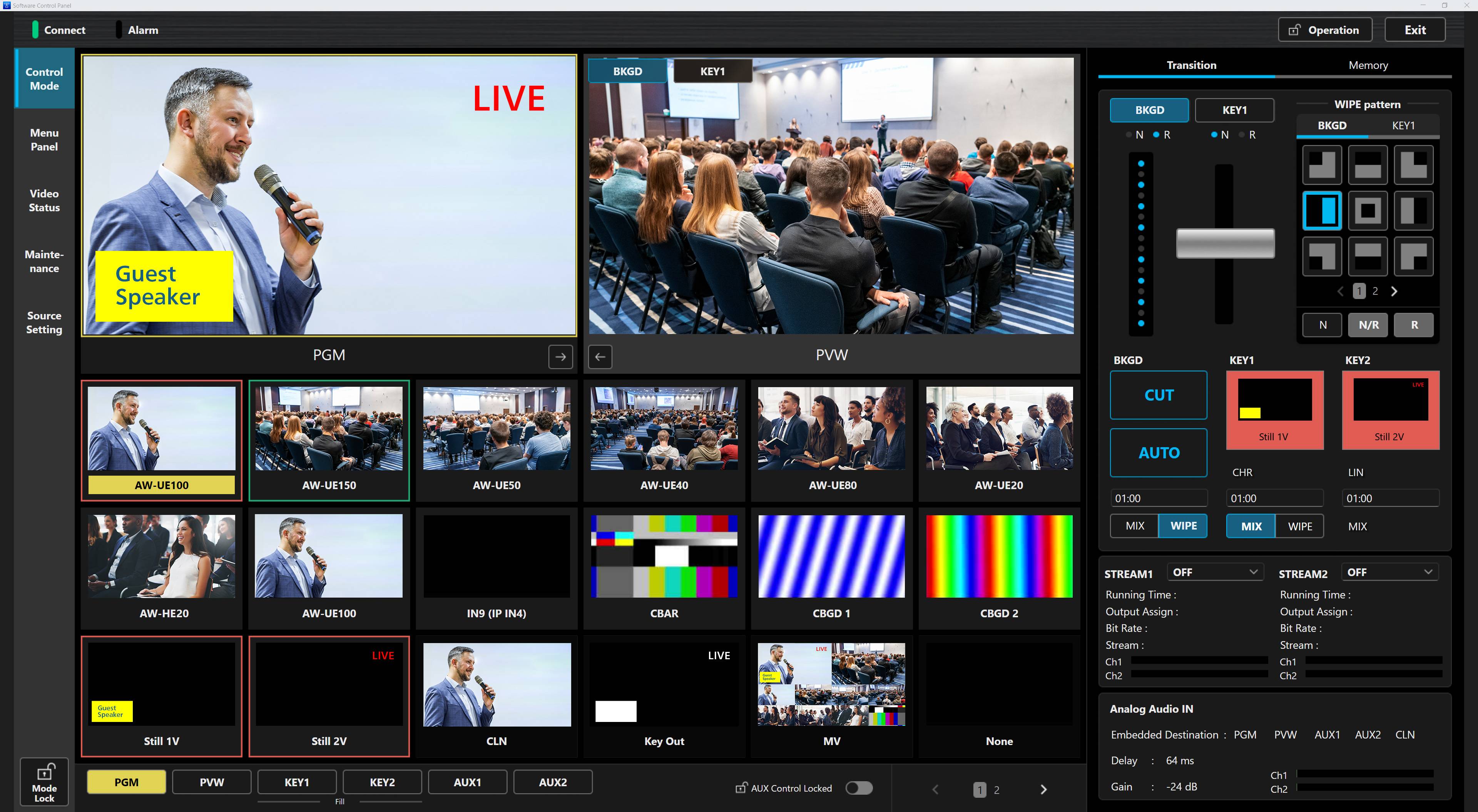 Yeni yazılım kontrol paneli, anahtarlayıcı işlevlerinin bir bilgisayar veya tabletten (Windows 10/11 veya MacOS Monterey/Ventura/Sonoma) rahatça kontrol edilmesini sağlayacak. Geleneksel olarak düğmeler ve düğmelerle gerçekleştirilen giriş/çıkış kaynaklarının ayrıntılı ayarları ve onayı, bilgisayar klavyesi veya dokunmatik ekran ile kolayca gerçekleştirilebiliyor. Çekim öncesi ve esnasındaki sürece verim katmak için çekme belleğinin sıralanması ve fotoğraf belleğinin doğrudan yazılması/değiştirilmesi gibi yazılım kontrol panellerine özel işlevleri de bulunuyor. GUI, birden fazla video girişi/çıkışı arasında kolay geçiş sağlamak için Panasonic'in popüler büyük anahtarlayıcılarına benzer şekilde kontrol ekranını, canlı video izlemeyi ve çoklu görüntüleyiciyi entegre ediyor. Sezgisel GUI, minimum deneyime sahip operatörler de dahil olmak üzere tek bir kişi tarafından kolayca kullanılabiliyor.