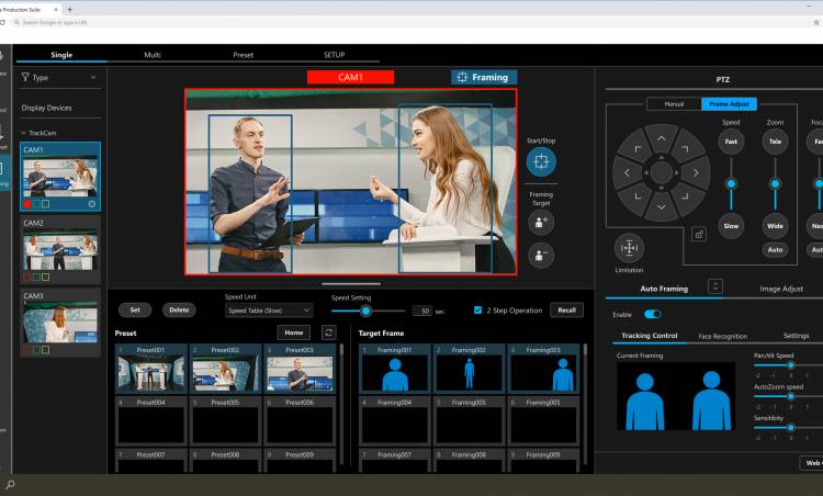 Sezgisel kurulum ve kullanımı sürdürmek için kullanıcı arayüzünün tasarımı ve çalışma prensibi Media Production Suite'inkilerle tutarlıdır ve kullanıcı dostu bir kontrol paneli bulunmaktadır. Gelişmiş Otomatik Kadrajlama eklentisinin kullanıcı arayüzü, birden fazla PTZ kameranın kolay yönetimi için çoklu kamera görüntüleme seçeneği içerir. Yüksek içerik kalitesi sağlamak için sınırlı personelin bulunduğu ortamlarda bile çoklu kamera çekimini kolaylaştırmak için birden fazla kaynak, tek bir ekrandan izlenebilir ve kontrol edilebilir.