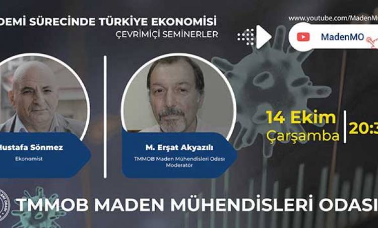 TMMOB’un düzenlemiş olduğu Pandemi Sürecinde Türkiye Ekonomisi Çevrimiçi Semineri TMMOB Maden Mühendisleri Odası Genel Sekreteri A. Erşat Akyazılı’ nın moderatörlüğünde Ekonomist Mustafa Sönmez’ in katılımıyla gerçekleştirilecek.