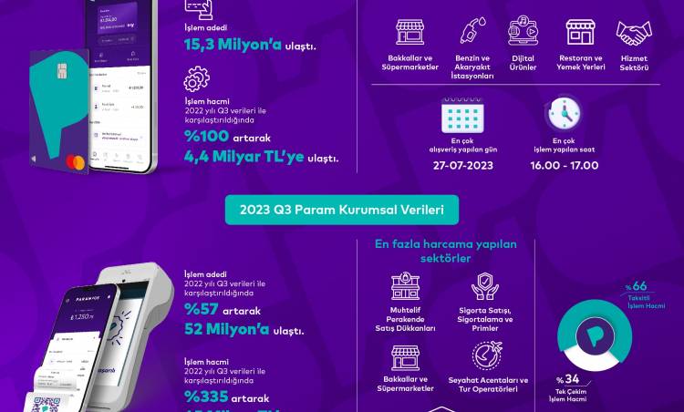 Üçüncü çeyrek verilerini değerlendiren Param Kurucu ve CEO'su Emin Can Yılmaz, “2023'ün üçüncü çeyreğini de büyümemizi sürdürerek başarıyla geride bıraktık. Geçen senenin aynı dönemine göre ParamKart ile gerçekleşen işlemlerin hacminde iki kat, ParamPOS'un işlem hacminde ise dört buçuk kat artış yaşandı. Ek olarak ihraç edilen ParamKart yıl sonu hedefimizi de üçüncü çeyrek itibariyle gerçekleştirdik. 91 bin üye işyerinin olduğu ParamPOS'ta ise 2023 ciro hedefimiz, yıl sonunda 160 milyar TL'ye ulaşmak. Türkiye'de ve dünyada büyüme stratejisiyle başladığımız 2023 yılını rekorlarla geride bırakmaya hazırlanıyoruz. Önümüzdeki süreçte de bütünleşik finans sağlayıcısı olarak uçtan uca çözümler sunmaya ve finansal teknoloji alanındaki farklı çözümlerimizle ekosistemimizi büyütmeye devam edeceğiz” dedi.