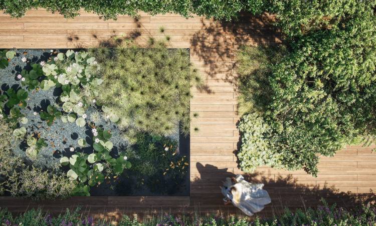 Doğa ve yapılı alanın sorunsuz bir şekilde birleştiği bu entegre ortamda, dış mekan ürünleri farklı tür ve mevsimlik bitkilerle simbiyotik bir diyaloga giriyor. Sulak alan bahçesi, tozlayıcı çatı, yenilebilir orman bahçesi, tropik avlu, çok yıllık bahçe ve koza gibi altı farklı habitat, konuklara ve ziyaretçilere bitkisel ve kromatik yollar, ışık ve renk vurguları ve Paola Lenti'nin estetik diline özgü hassas - hatta bazen eğlenceli - zarafetle karakterize edilen mobilyalar sunuyor.