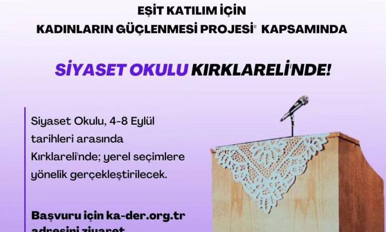 Siyaset Okulu etkinliği, 4-8 Eylül tarihleri arasında Kırklareli'nde düzenlenecek. Eğitim, İstanbul, Çanakkale, Edirne ve Tekirdağ'dan da katılımcılara açık olacak. Program, Türkiye'deki seçimler kapsamında, kadınların siyasi hayatta güçlenmesini ve liderlik becerilerini geliştirmeyi hedefliyor.
