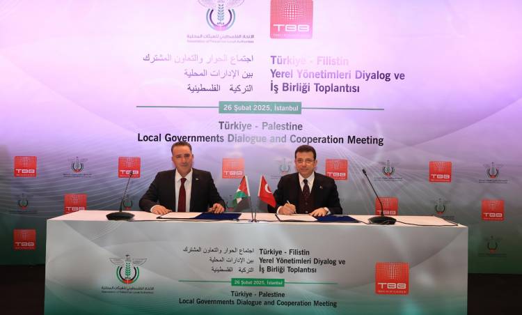 Türkiye Belediyeler Birliği (TBB) ve Filistin Yerel Yönetimler Birliği (APLA) arasında, iki ülkenin yerel yönetimleri arasındaki iş birliklerini güçlendirmek amacıyla mutabakat metni imzalandı. TBB ve İstanbul Büyükşehir Belediye (İBB) Başkanı Ekrem İmamoğlu ile APLA ve Salfeet Belediye Başkanı Abdul Karim Al-Zubaidi, imzaları atmadan önce, “Türkiye-Filistin Yerel Yönetimleri Diyalog ve İş Birliği Toplantısı” başlığıyla düzenlenen etkinlikte birer konuşma yaptı.