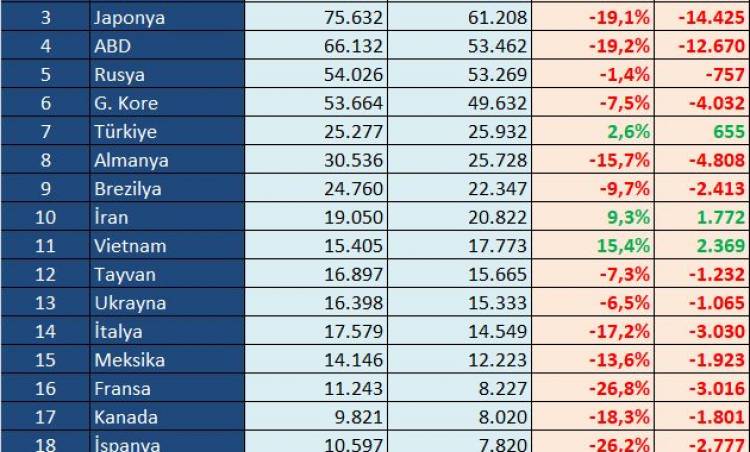 Kanada, İspanya, ABD, Japonya, Fransa, İtalya, Polonya, Hindistan ve Almanya'da çift haneli düşüşler gözlendi.