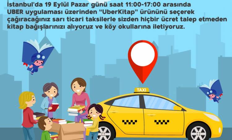 UBER ile Herkese Kitap Vakfı el ele vererek kitap dostlarından toplayacakları kitapları ihtiyaç sahibi okullara gönderecek. 19 Eylül Pazar günü 11:00-17:00 saatleri arasında İstanbul il sınırları içinde UBER sarı taksi çağıran herkese ücretsiz gidip bağışlayacakları kitapları alacak. Toplanan kitaplar Herkese Kitap Vakfı tarafından Türkiye’nin dört bir yanında kitabı olmayan okullara gönderilecek.