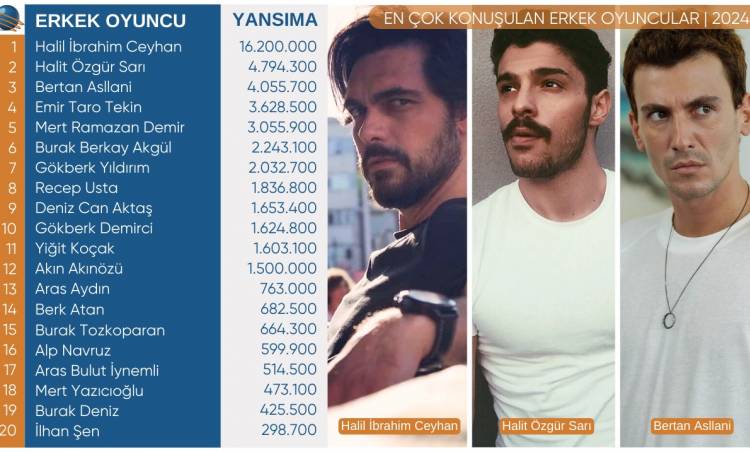 Listenin zirvesinde, Leyla dizisinde Tufan karakterini canlandıran Halil İbrahim Ceyhan yer alıyor. Ceyhan, performansıyla yıl boyunca büyük beğeni topladı ve X’te 16 milyon 200 bin paylaşıma konu oldu. İkinci sırada, Yabani dizisinde Yaman karakterini canlandıran Halit Özgür Sarı bulunuyor. Sarı, dizideki oyunculuğuyla izleyiciden tam not aldı ve X’te 4 milyon 794 bin 300 kez konuşuldu.