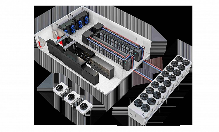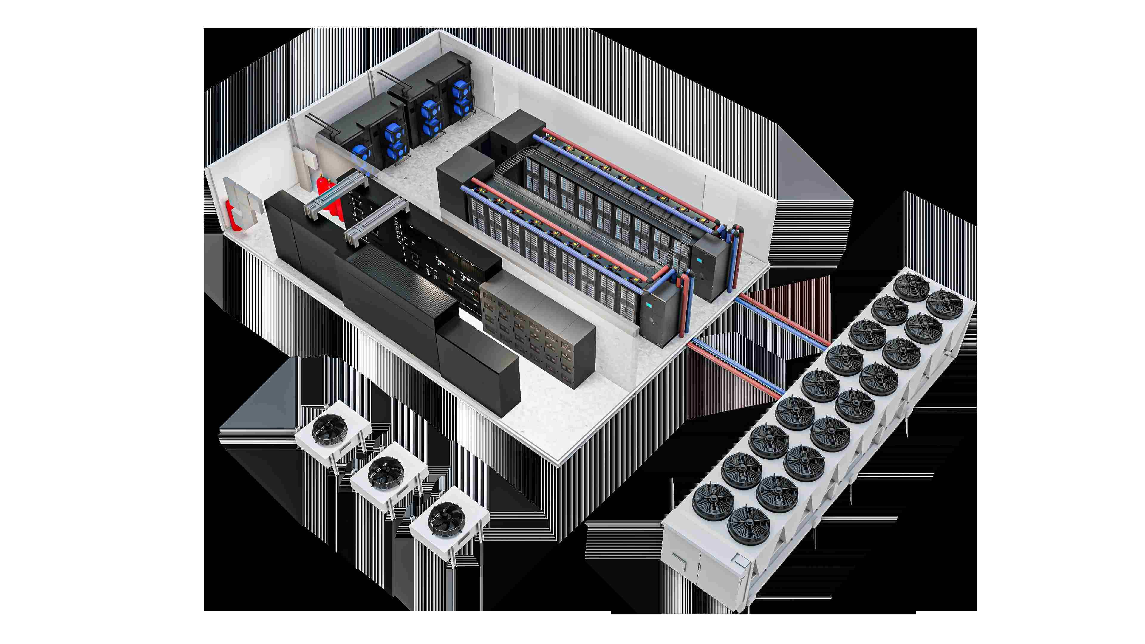 * Yüksek yoğunluklu bilgi işlem: MegaMod™ CoolChip, entegre tesisatı ve yüksek yoğunluklu Vertiv™ raf güç dağıtım üniteleri (rPDU'lar) olan ekipman raflarına entegre edilmiş hızlandırılmış bilgi işlem platformları da dahil olmak üzere müşterinin seçtiği yapay zeka bilgi işlem sağlayıcısının BT sistemlerini destekliyor. Yapay zeka bilgi işlem sağlayıcılarından müşterinin seçtiği entegre raflar da prefabrik ünitelerde birleştirilebiliyor.