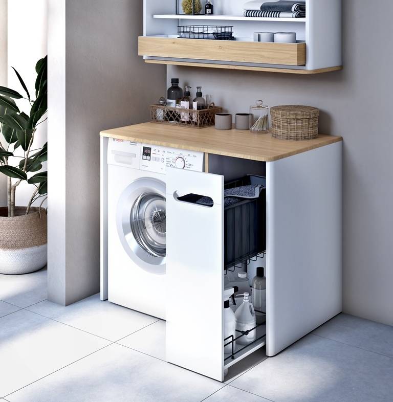 Sento’nun 105 cm genişliğindeki çamaşır makinesi dolabıyla bir çamaşır köşesi oluşturularak makinadan deterjana, kirli sepetinden havlulara kadar pek çok şey tek bir alanda toplanabiliyor. Aynı genişlikteki üst dolap da banyodaki havlu, tuvalet kağıdı gibi malzemelere alan açıyor. Gözden uzak olması istenen temizlik kovası ve sapı gibi gereçleri saklamak için ideal bir çözüm oluşturan 55 cm enindeki boy dolapları ise iç kısmında bulunan hava menfezleriyle dolap içerisinde kötü koku ve nem barındırmıyor.