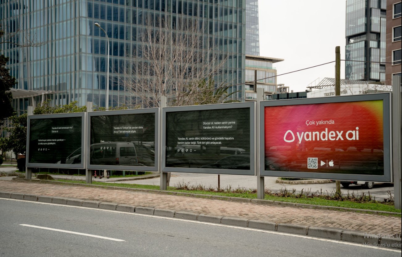 Yandex, yeni yapay zekâ uygulamasının lansmanı öncesinde İstanbul'un dört bir yanında cesur bir reklam kampanyası başlattı. Google'ın İstanbul ofisinin karşısındaki bir billboard da dâhil olmak üzere; Kanyon, Zorlu ve Akasya alışveriş merkezlerindeki dijital ekranlar, istasyon billboard'ları, şehir geneline yayılan dijital mecralar ve hatta markalı bir kamyon üzerinden hayata geçirilen kampanya, farklı yapay zekâlarla kurgulanmış diyaloglara yer veriyor. Bu diyaloglar, yakında tanıtımı yapılacak Yandex AI uygulamasının Türkiye'nin kültürel dinamiklerine daha yakın bir seçenek olduğunu cesur bir dille aktarıyor.